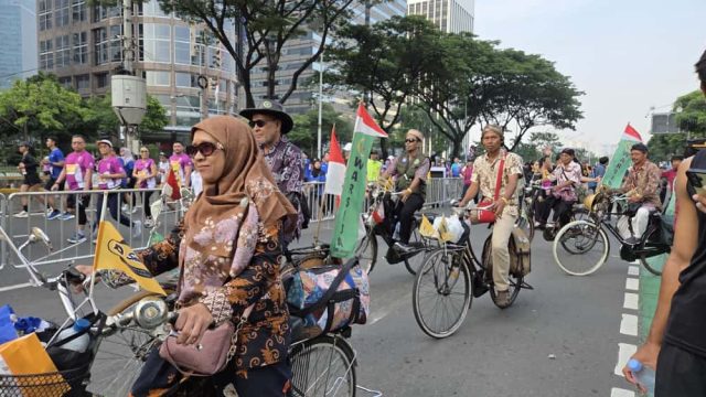 Parade epeda onthel berhias batik khas berbagai daerah di Indonesia ikut meramaikan Festival BAtik Nusantara 2025 yang digelar di di kawasan Jalan Jenderal Sudirman, Jakarta. (foto: dok SnackVideo)